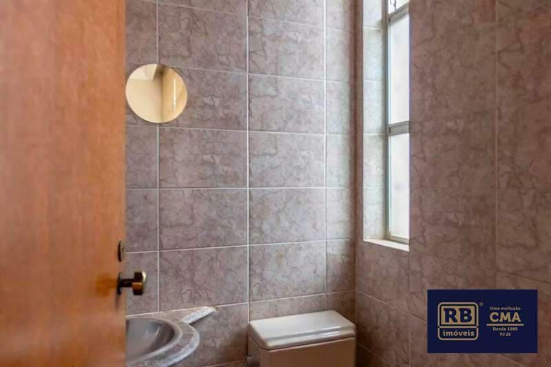 Banheiro social com acabamento em cerâmica, box Blindex e bancada em granito.