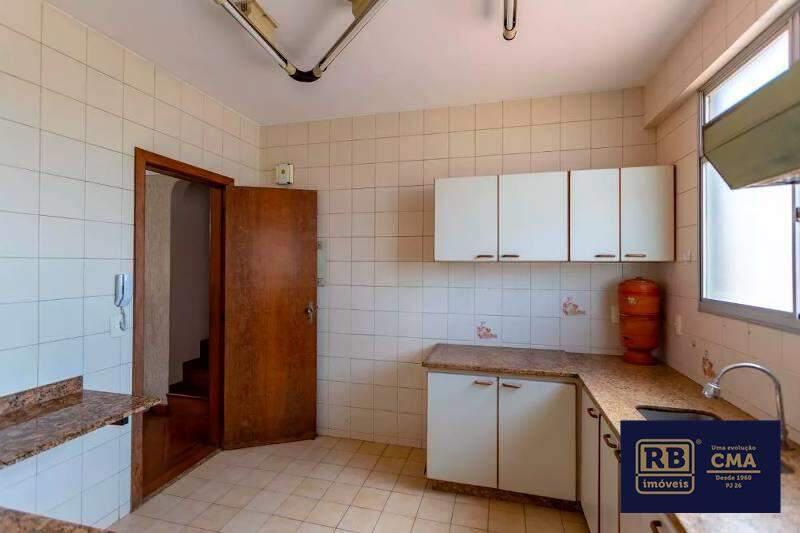 Cozinha espaçosa com piso em cerâmica, bancada em granito e armários planejados.