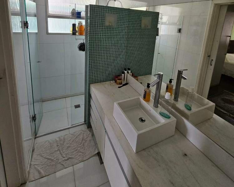 Banheiro social com bancada em granito, armários, espelho e box em blindex