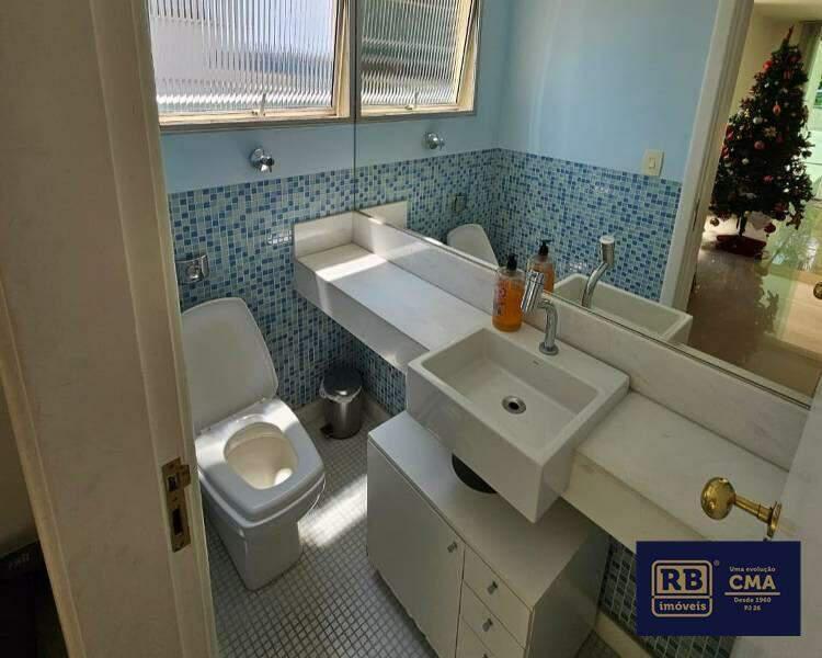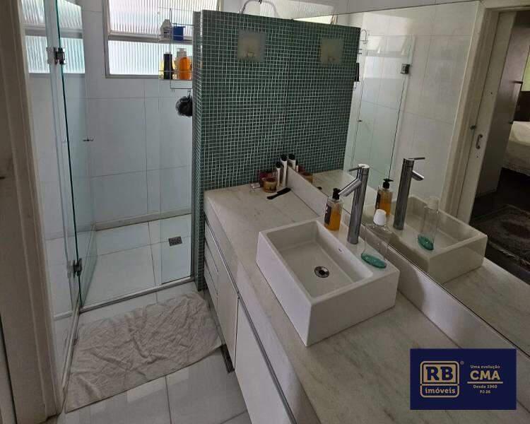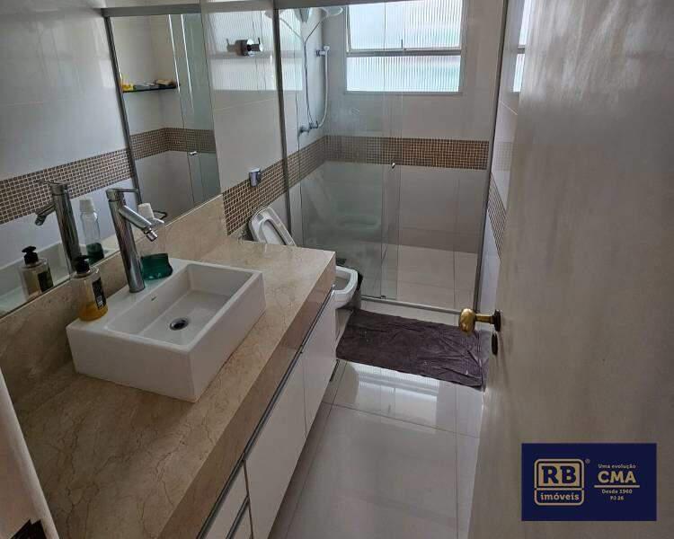 Banheiro social com bancada em granito, armários, espelho e box em blindex