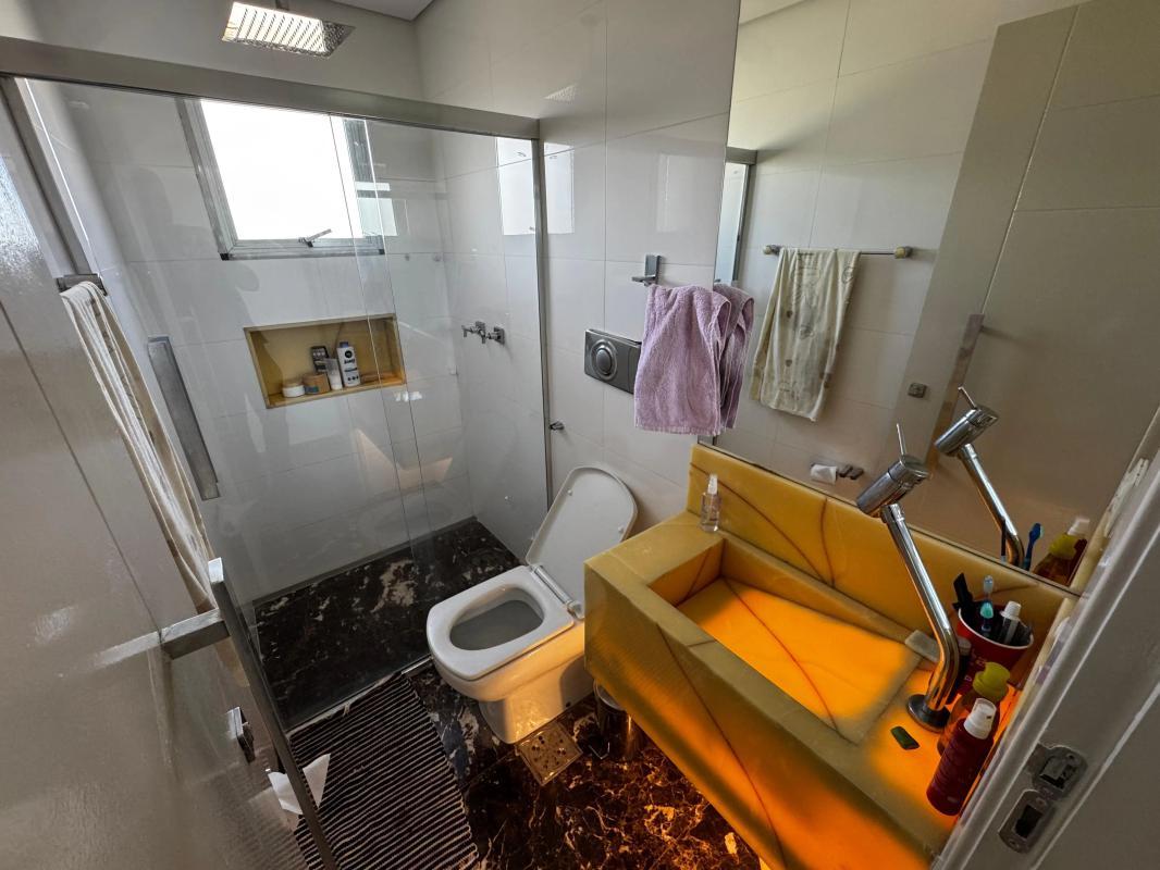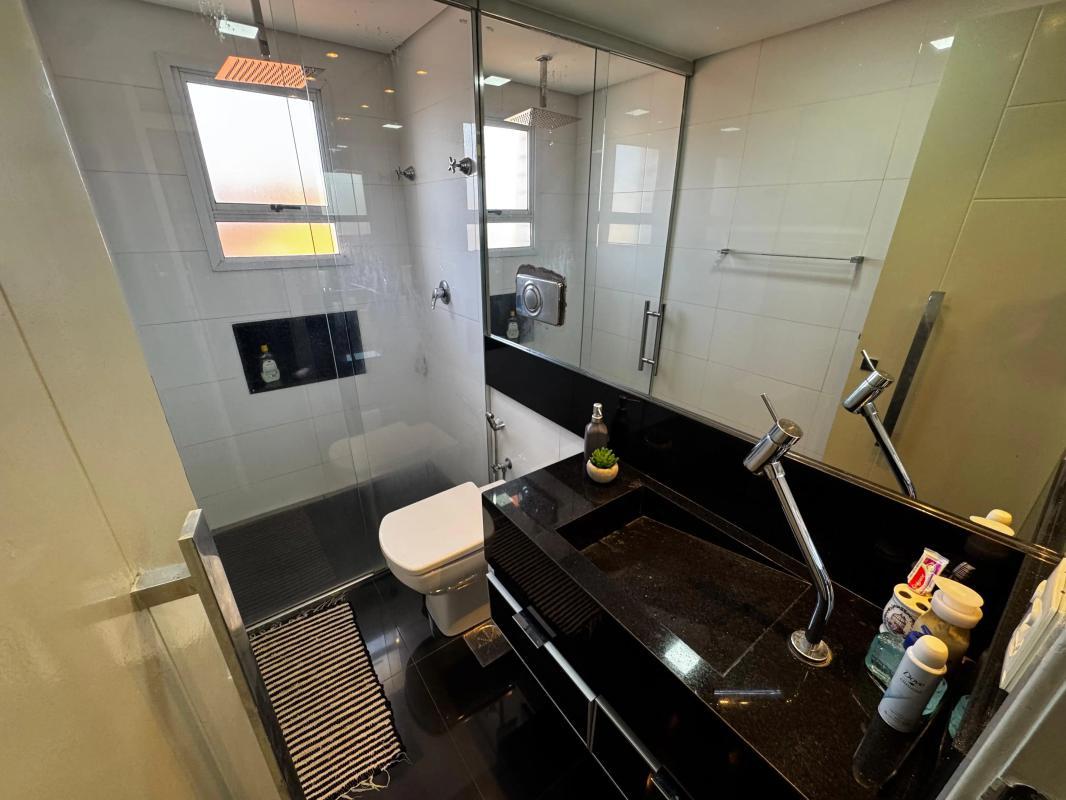 Banheiros das suítes com bancada em granito, armário, espelho e box em blindex