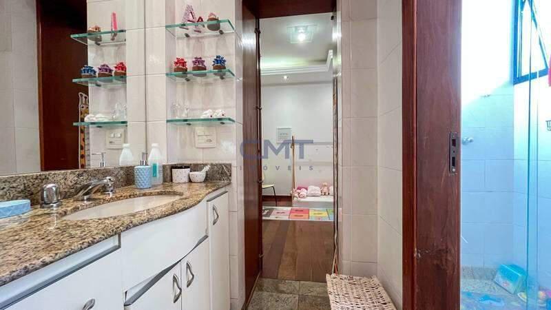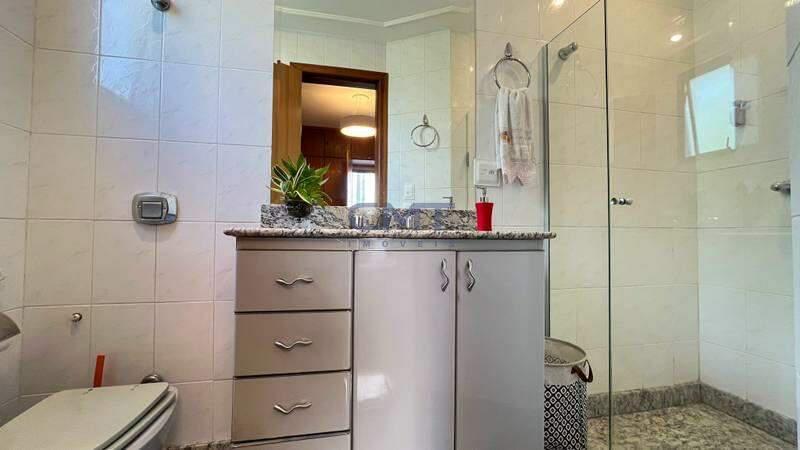 Banheiro social amplo com armários planejados, box em blindex e espelho;