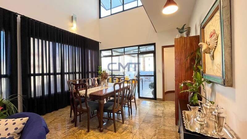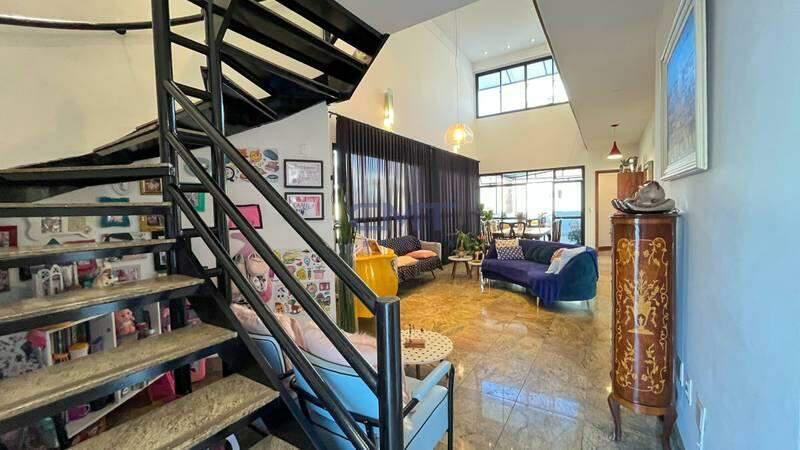 Sala ampla para três ambientes com pé direito duplo e piso em granito, ideal para receber com conforto e comodidade