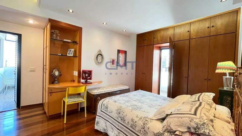 3 quartos amplos, todos com teto rebaixado e iluminação planejada, sendo 2 semi-suítes com espelho, armários planejados e box em blindex uma suíte com espelho, armários planejados, box em blindex, piso em tábua corrida e duas varandas