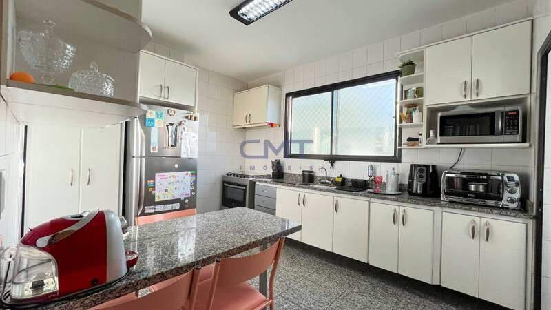 Cozinha espaçosa com bancada e piso em granito, armários planejados e bancada americana, oferecendo praticidade ao ambiente