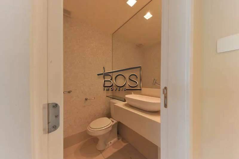 Suíte master com banheiro espaçoso, armários, espelho, 2 duchas, bancada em mármore com armário e 2 lavatórios.