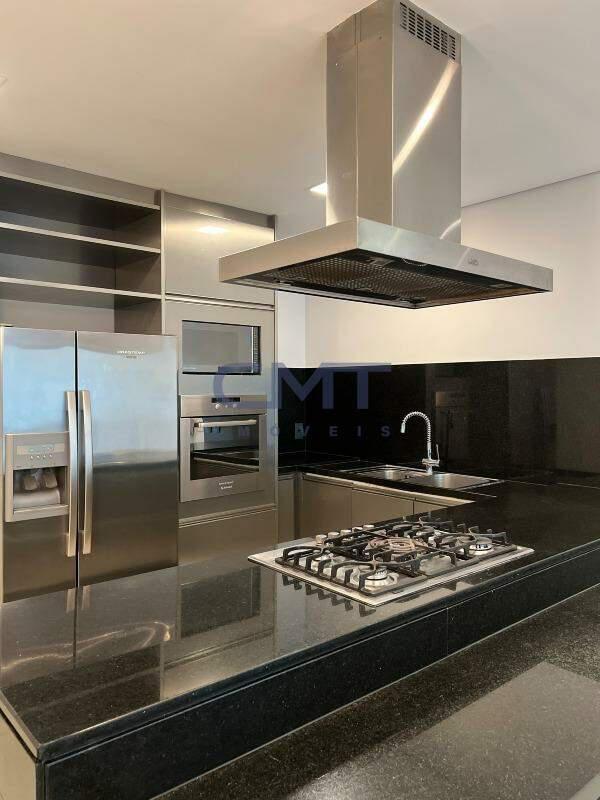 Cozinha bem iluminada e ventilada, com armários planejados, bancadas em granito preto e despensa.