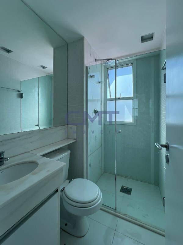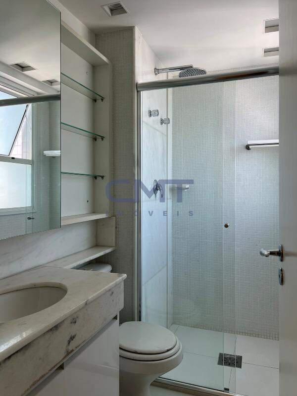 Suíte master com banheiro espaçoso, armários, espelho, 2 duchas, bancada em mármore com armário e 2 lavatórios.