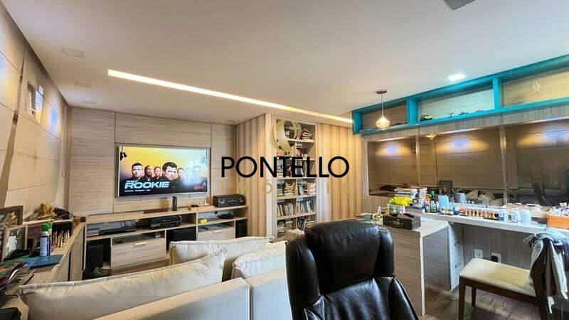 Sala de tv com piso em vinílico de madeira, móveis planejados, teto rebaixado e iluminação planejada
