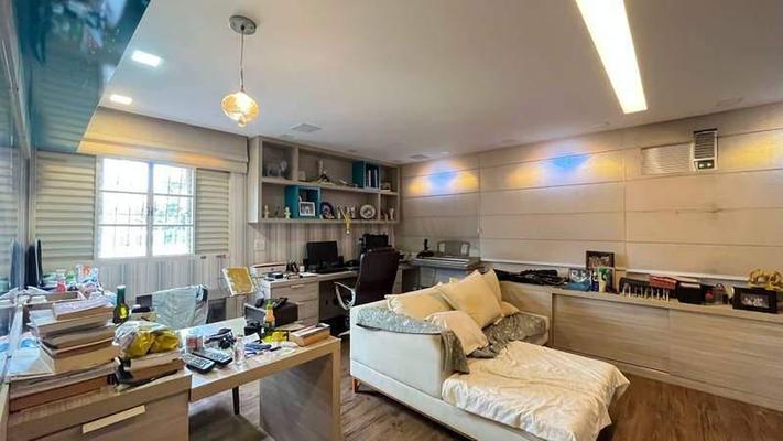 1 Quarto amplo com teto rebaixado, iluminação planejada, armários, sendo a suíte com bancada em granito, espelho, armários, box em blindex, banheira e