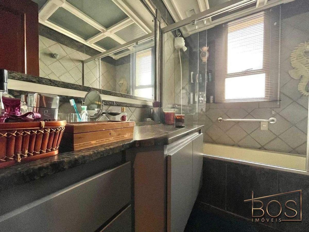 - Banheiro social com bancada em granito, armários e banheira de hidromassagem;