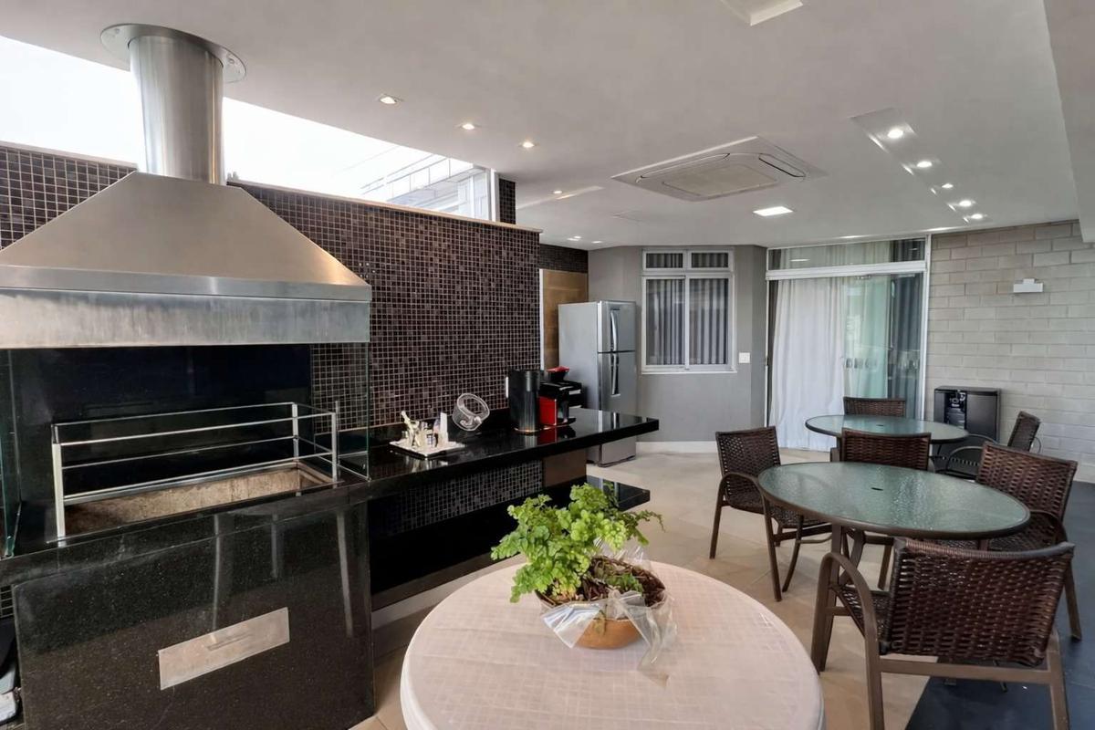 Espaço gourmet sofisticado, equipado com churrasqueira, armários planejados, bancada em granito, ar-condicionado central e projeto de iluminação cuidadosamente elaborado.