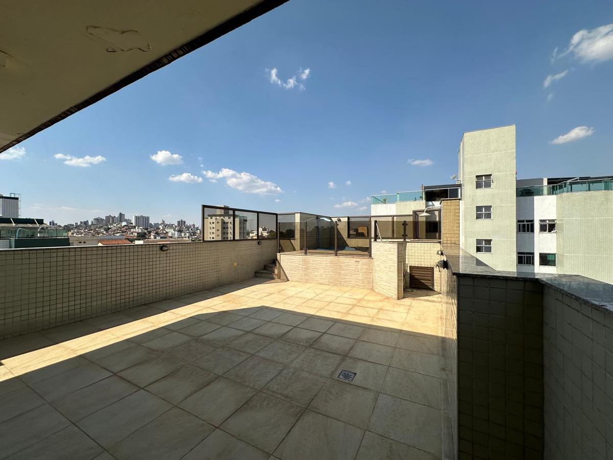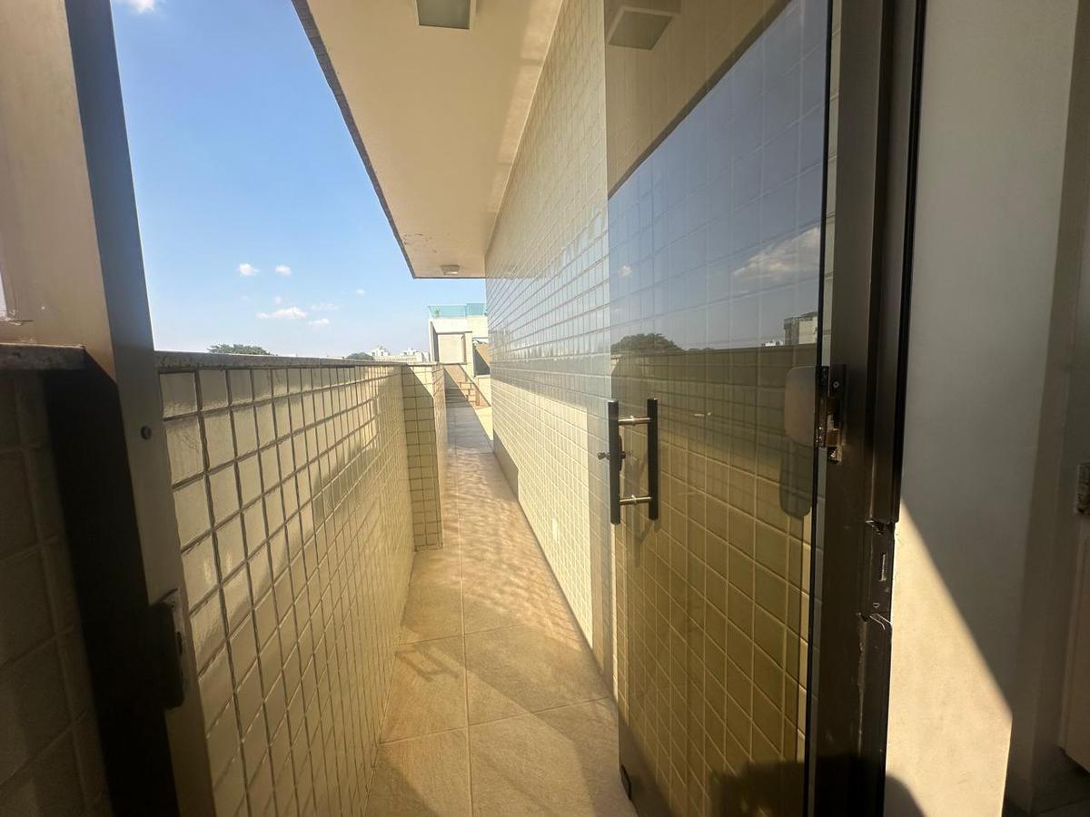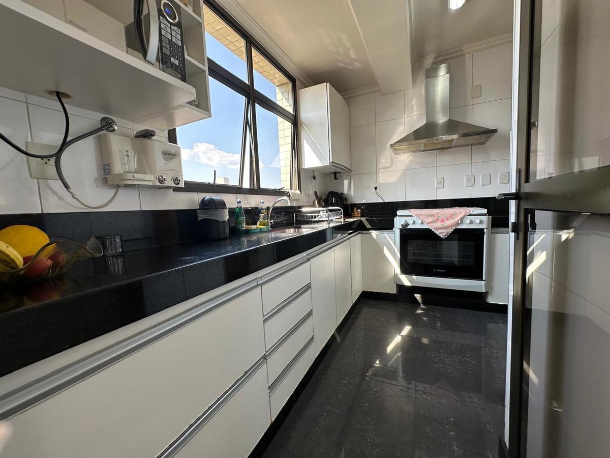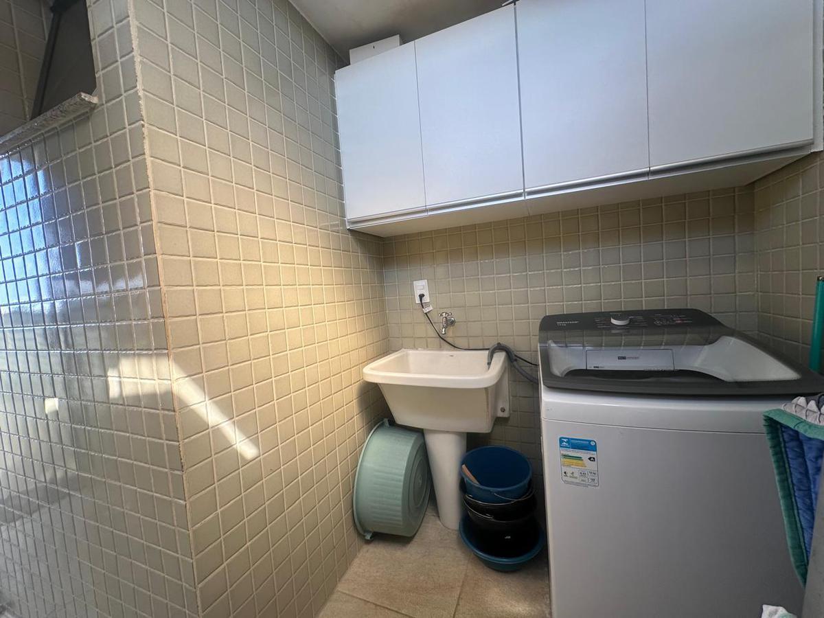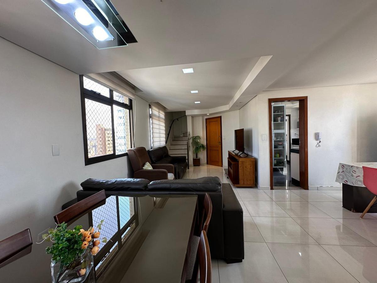 A cobertura conta com uma área de lazer exclusiva com piscina, além de uma área de serviço no andar superior. A cozinha é toda planejada, com armários modernos e espaços bem aproveitados.