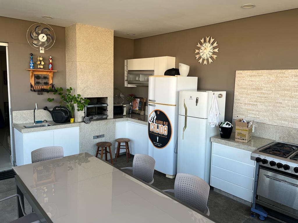 COZINHA ESPAÇO GOURMET COM PIA, BANCADA E CHURRASQUEIRA, LINDA VISTA, SALA DE TV COM PAREDES EM VIDRO TEMPERADO.