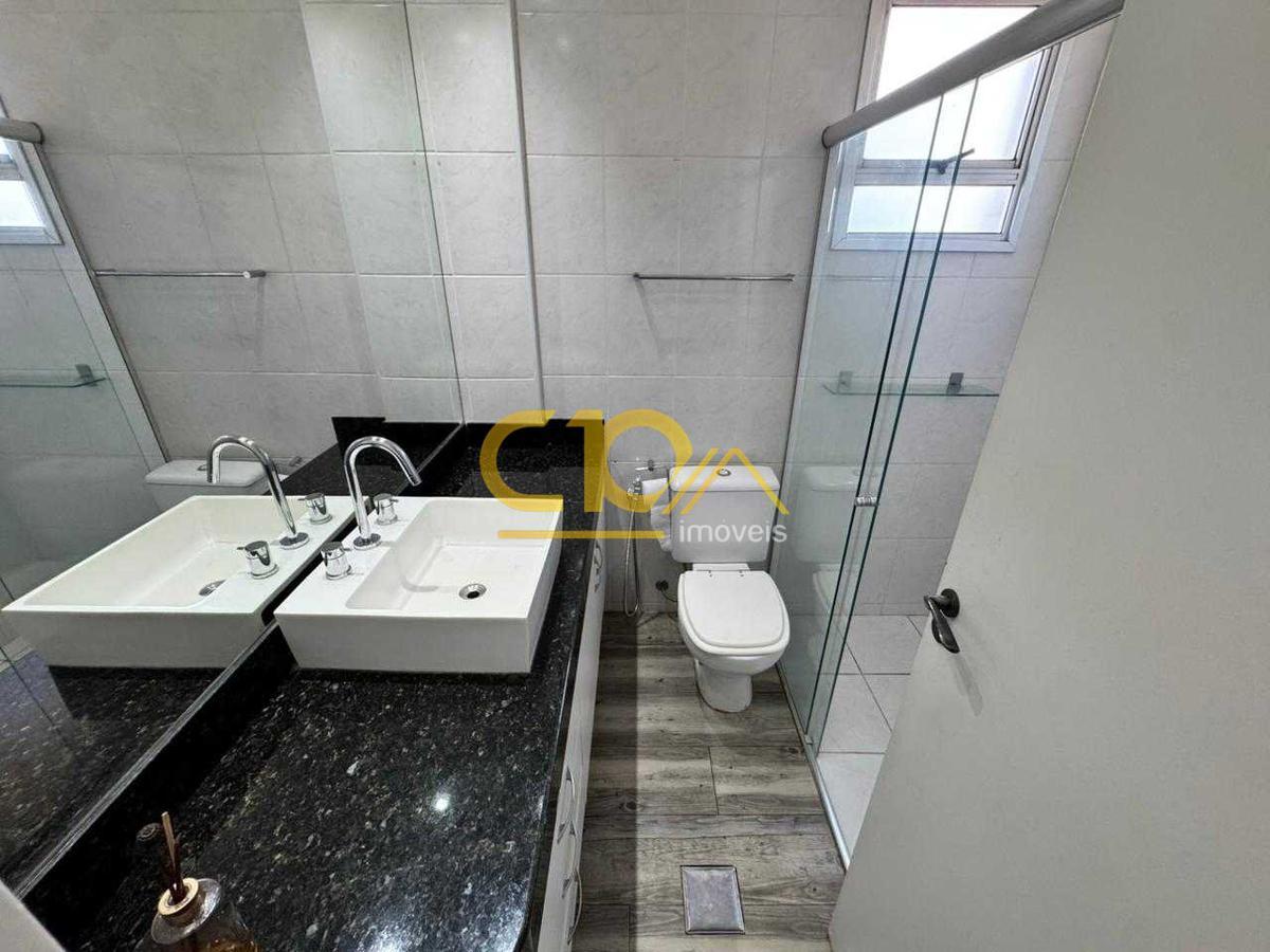 Banho social com bancada em granito, armário, espelho e box em blindex