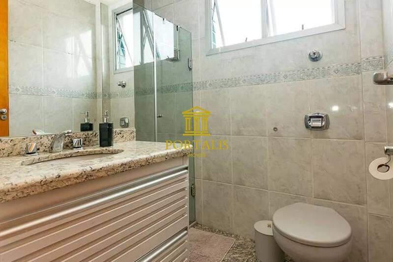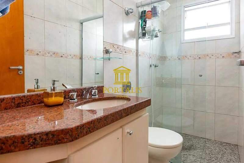 Banheiro social com espelho, bancada em granito, armários e box em blindex