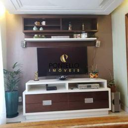 Sala de Televisão com rebaixamento em gesso, iluminação indireta e painel da televisão planejado;