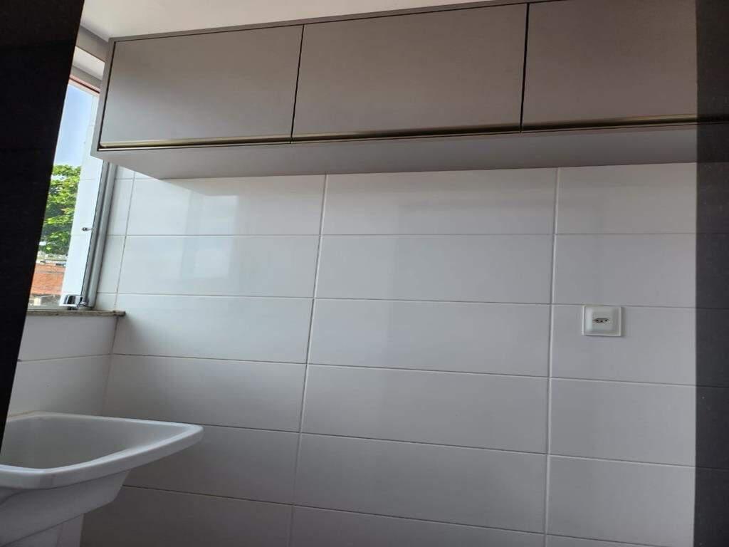 Cozinha em conceito aberto com armários, bancada de granito e piso em porcelanato, área de serviço com armários.