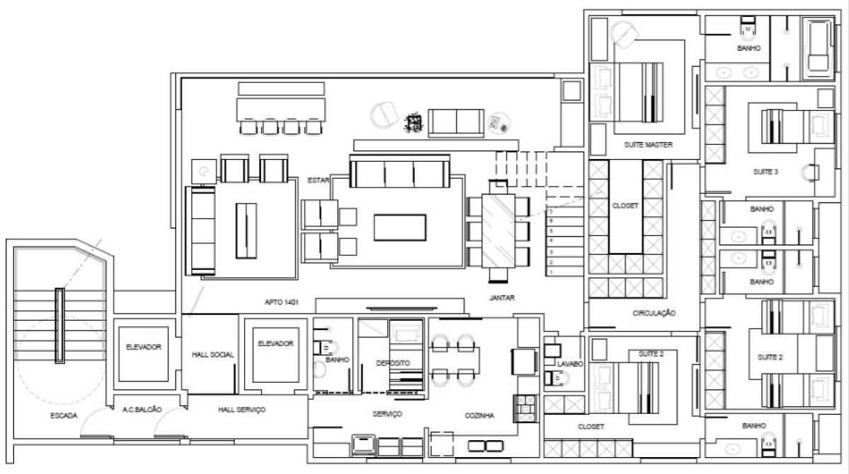 1° Pavimento: 04 quartos sendo 03 suítes e 01 suíte master com closet; sala de estar e jantar ampla; cozinha; 05 banheiros sendo 04 privativos e 01 social; área de serviço; deposito; elevador de acesso para o terraço.