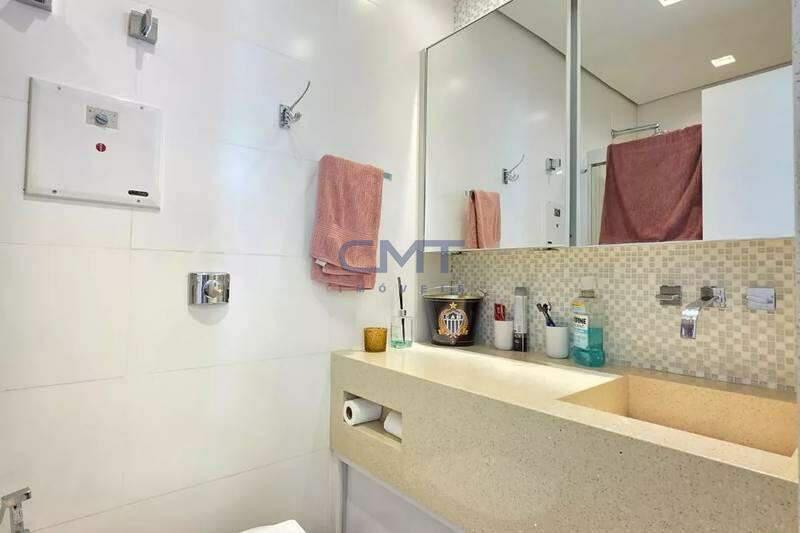 Banheiro social com espelho, bancada em granito, armários e box em blindex