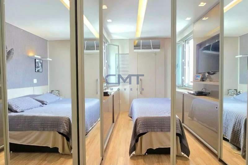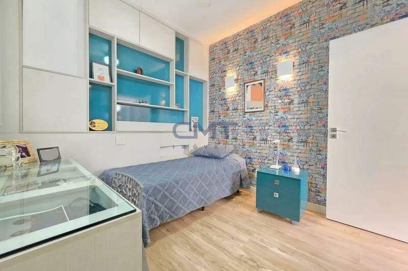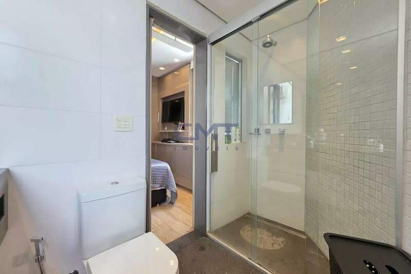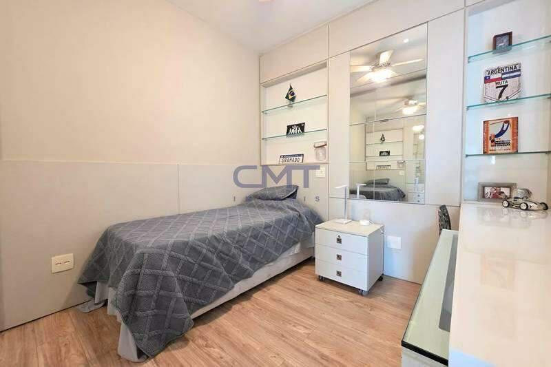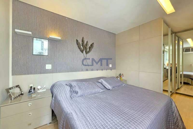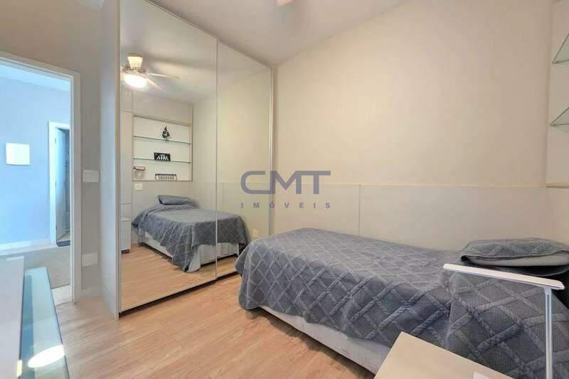 4 quartos amplos, todos com armários, piso vinílico amadeirado, teto rebaixado e iluminação planejada, sendo uma suíte com bancada em granito, espelho e box em blindex