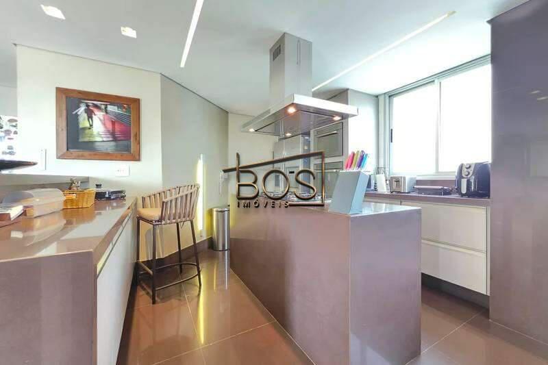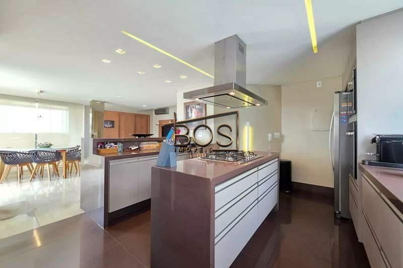 - Cozinha espaçosa, possuindo uma ilha central com bancada ampla e cooktop de cinco bocas embutido, além de coifa em inox suspensa, iluminação e armários todos planejados