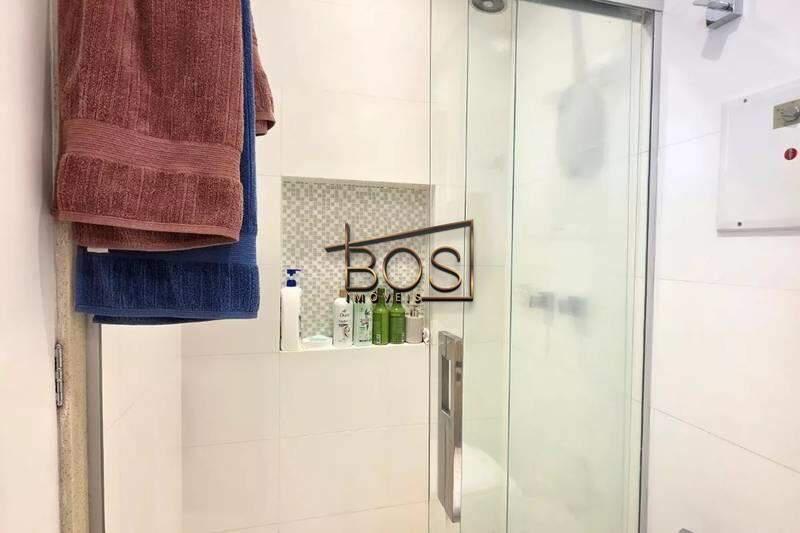 - Banheiro social com espelho, bancada em granito, armários e box em blindex