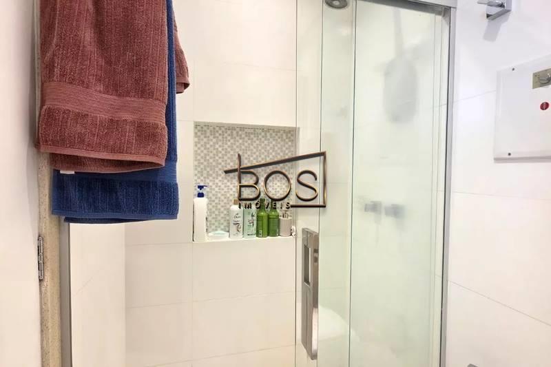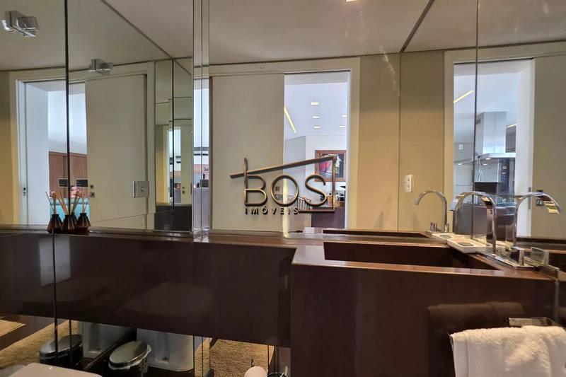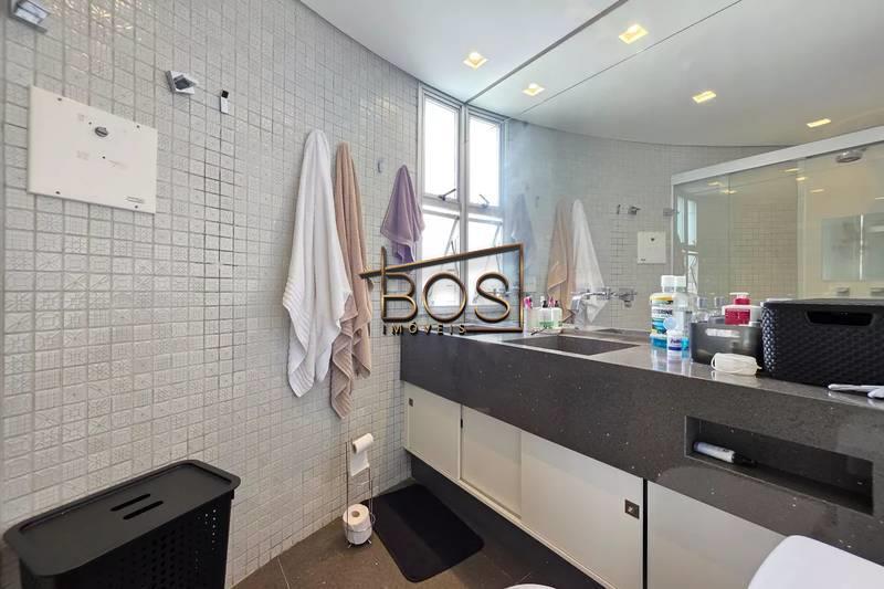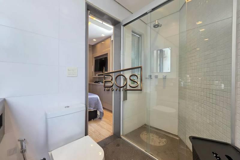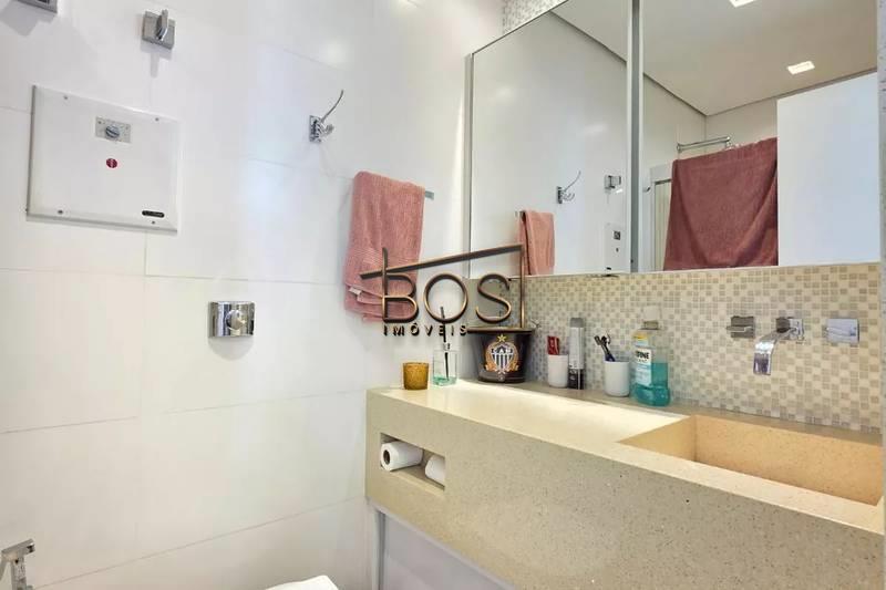 - Banheiro social com espelho, bancada em granito, armários e box em blindex