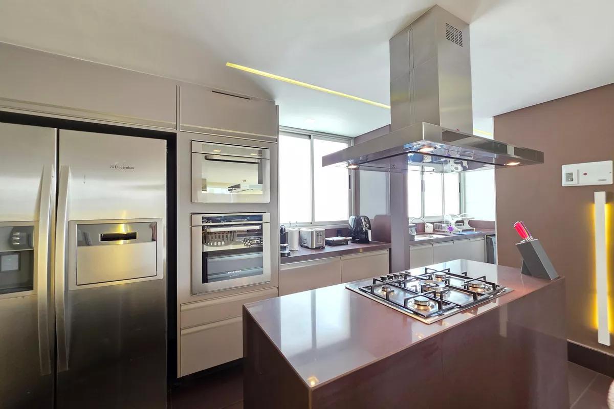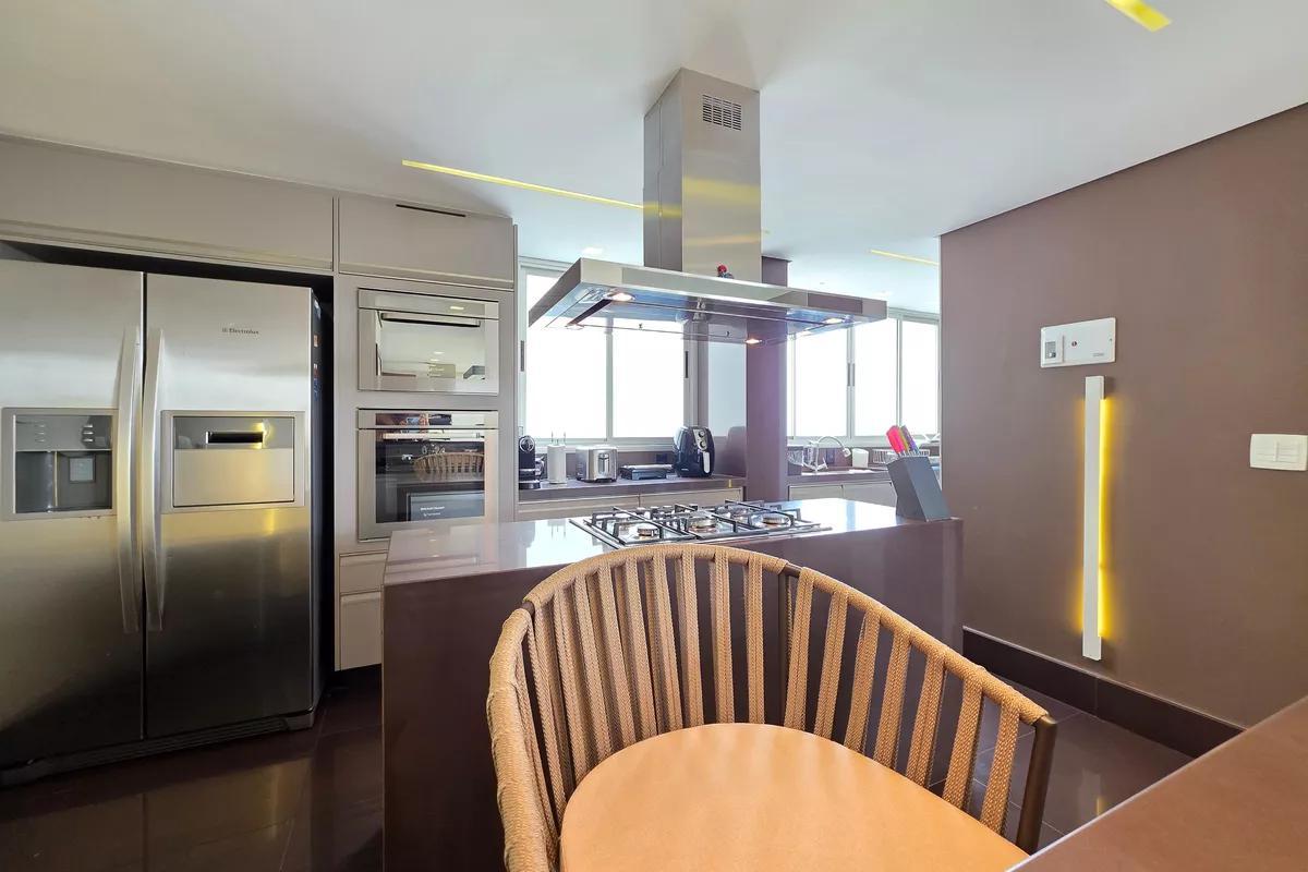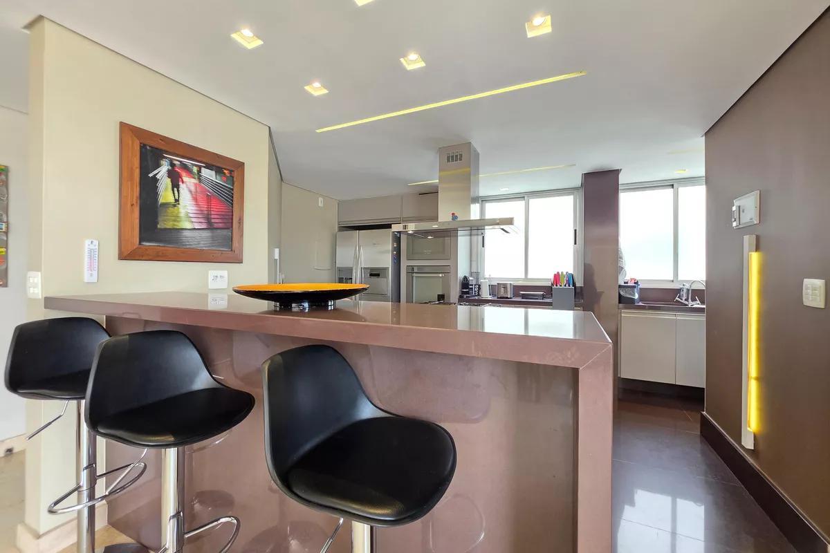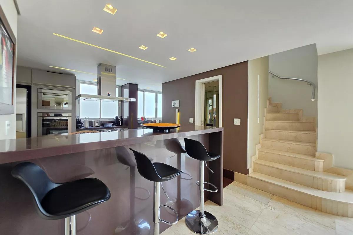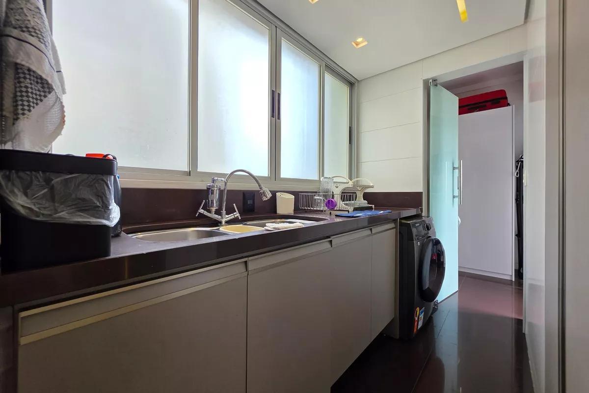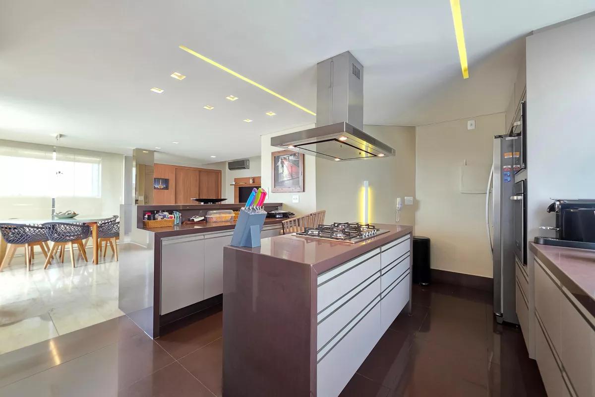 1 Pavimento 1 sala ampla para dois ambientes com piso em granito, teto rebaixado e iluminação planejada Área privativa ampla, completa, com churrasqueira, hidromassagem elevada, bancada em granito e armários planejados Escritório Cozinha espaçosa, possuindo uma ilha central com bancada ampla e cooktop de cinco bocas embutido, além de coifa em inox suspensa, iluminação e armários todos planejados Lavabo com bancada em granito Área de serviço com tanques e armários planejados 3 vagas de garagem cobertas e demarcadas