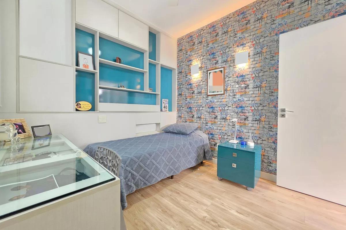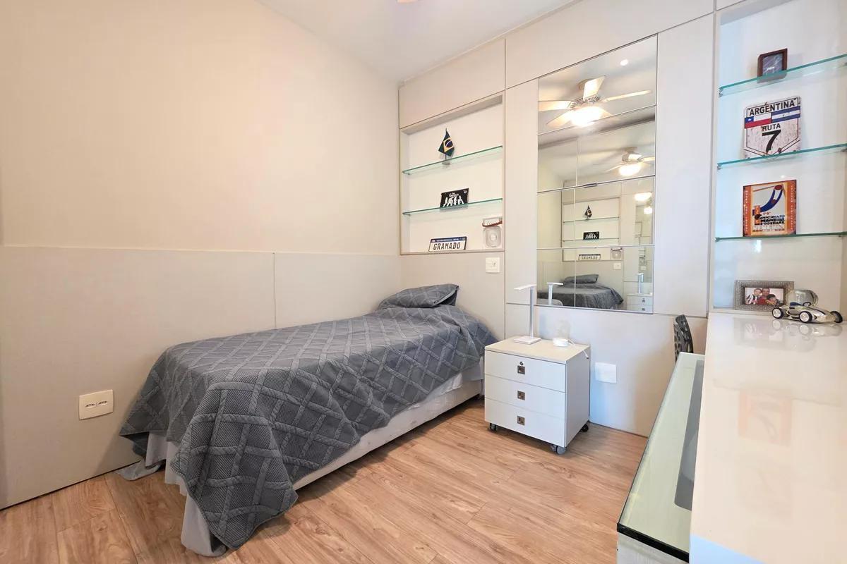 2 Pavimento 4 quartos amplos, todos com armários, piso vinílico amadeirado, teto rebaixado e iluminação planejada, sendo uma suíte com bancada em granito, espelho e box em blindex Banheiro social com espelho, bancada em granito, armários e box em blindex
