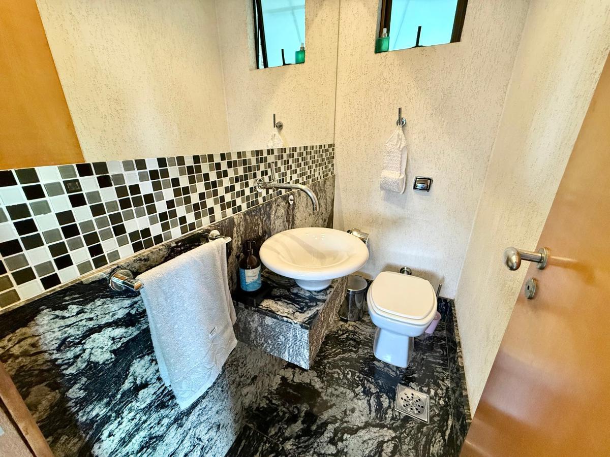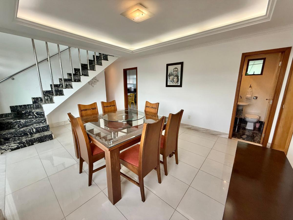 Uma sala de estar ampla, com rebaixamento em gesso, sanca iluminada e piso em porcelanato, conecta-se harmoniosamente à sala de jantar, criando o cenário perfeito para receber amigos e familiares. O lavabo segue o mesmo padrão de alto acabamento, com bancada em granito e iluminação planejada.