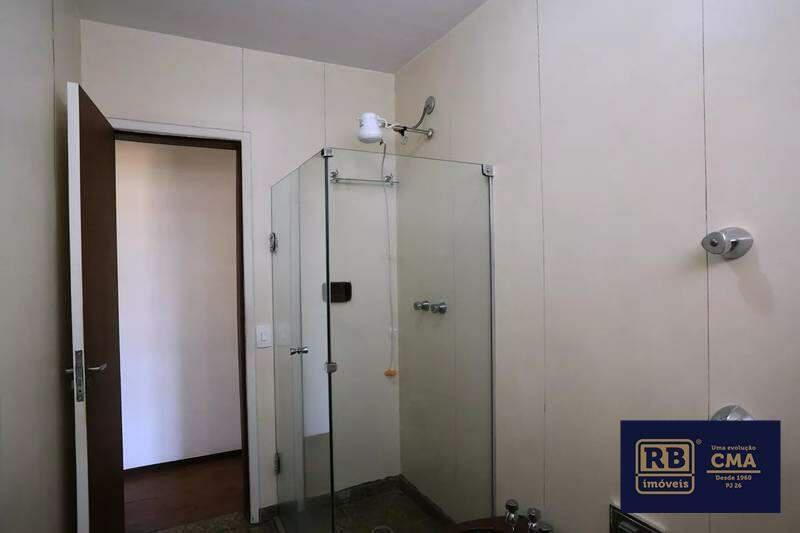 Banheiro da suíte com box em blindex, armários e espelho.