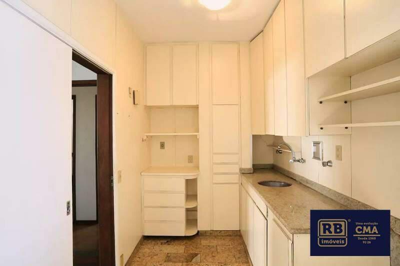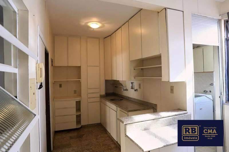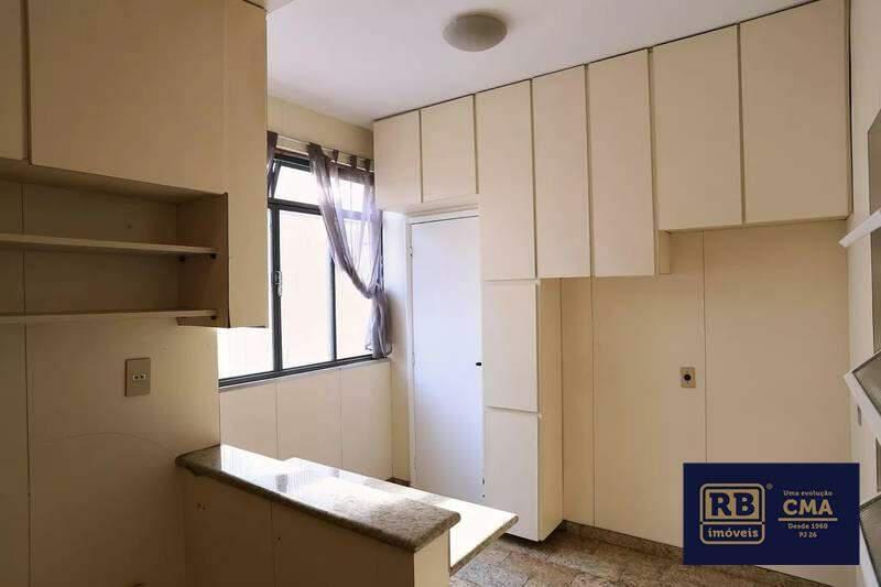 Cozinha com armários planejados, bancadas e piso em granito.