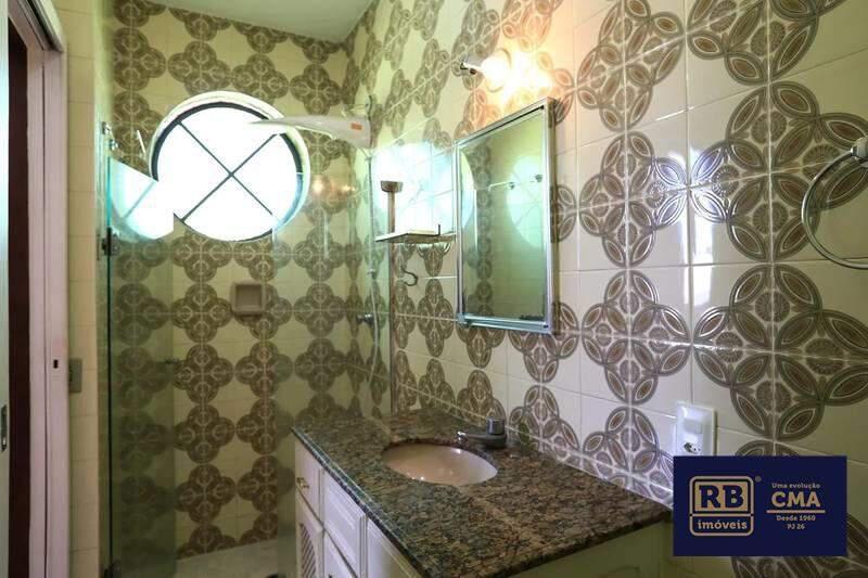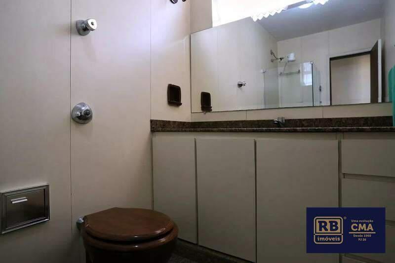 Banheiros (social e suíte) com armários planejados, espelho e box em blindex.