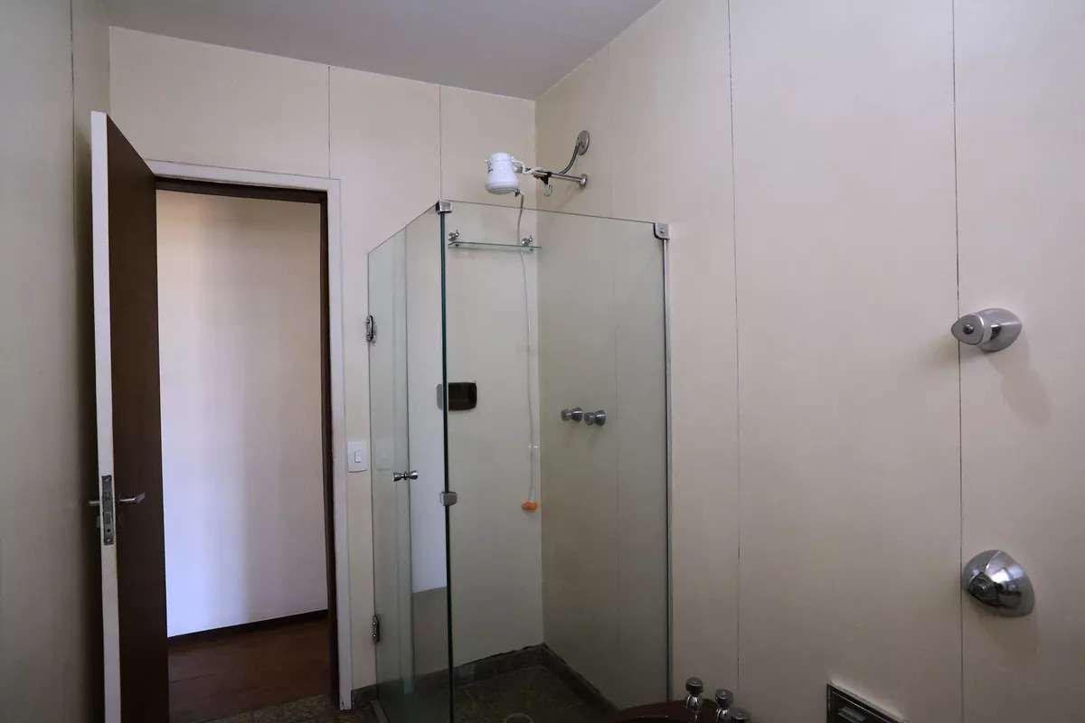Banheiro da suíte com box em blindex, armários e espelho.