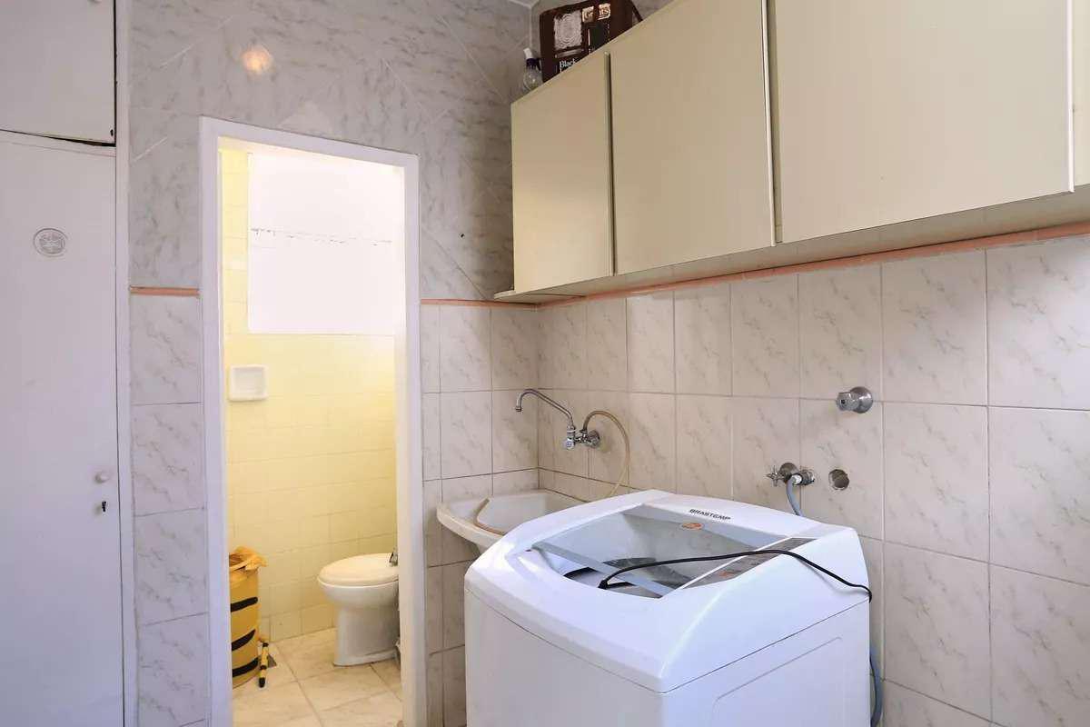 Ampla área de serviço individual com armários e banheiro de apoio.