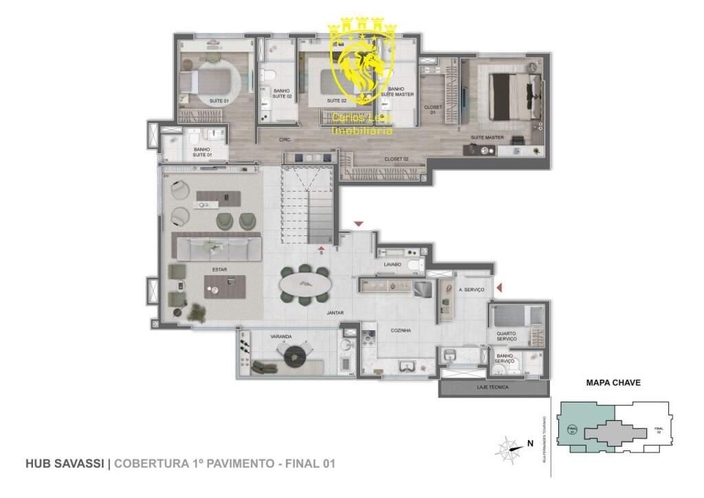 4 quartos, sendo 4 suítes, sala para 2 ambientes, lavabo, varanda, cozinha, área de serviço, dce.