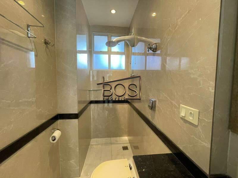 - Banheiro social com piso em porcelanato marmorizado em tons claros, bancada em granito preto, box em blindex em vidro temperado, - chuveiro com ducha e iluminação planejada