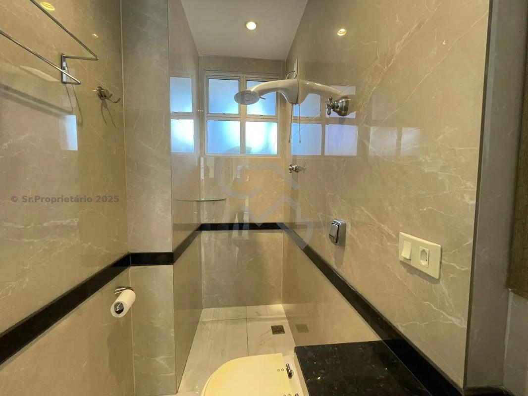 3 quarto amplos, um com piso em tábua corrida, e dois com piso em mármore, armários, sendo uma suíte com closet, revestido em mármore claro, box em vidro temperado, chuveiro com ducha metálica, iluminação embutida no teto, espelho e bidê