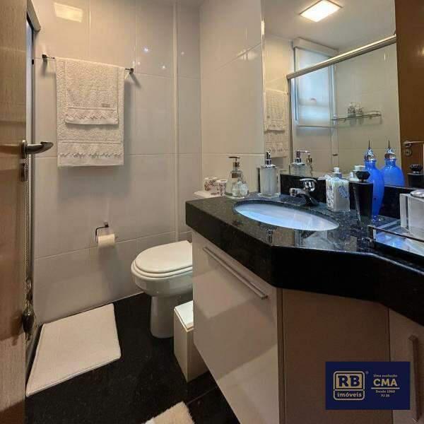 3 Quartos amplos com piso em laminado de madeira, sendo uma suíte com bancada e pia em granito, espelho e box em blindex