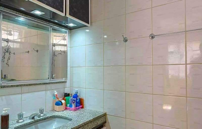 Banheiro social com bancada em granito, espelho, box em blindex e armários planejados