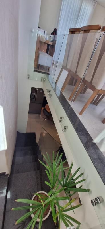 Escada para acesso ao segundo piso em granito, vidro temperado, e armário em baixo da escada que pode ser usado para varias finalidades