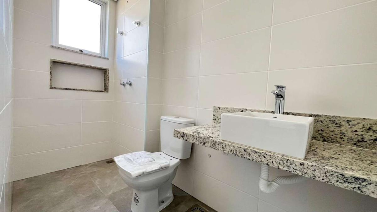 1 quarto amplo com piso em porcelanato, sendo a suíte com bancada em granito e pia em cuba de apoio