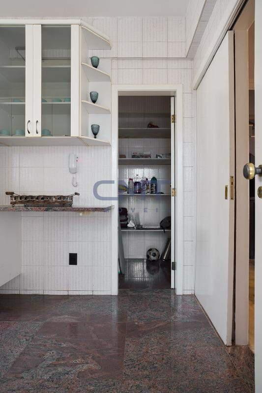 Cozinha ampla com armários planejados, piso e bancadas em granito. Acesso independente à área de serviço, com quarto e banheiro de serviço.