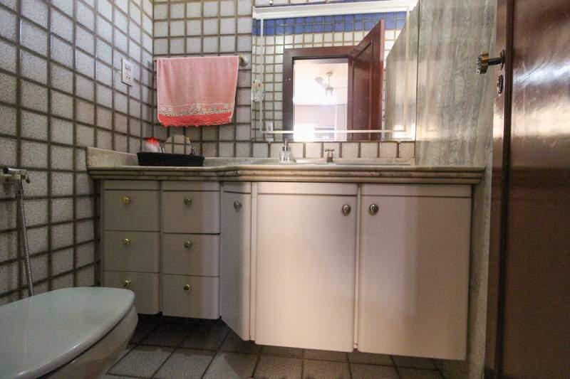 ¿ Banheiro social com piso em cerâmica, box blindex, armário e espelho.