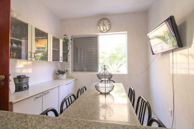 ¿ Cozinha integrada com piso e bancada em granito, armários e depurador;