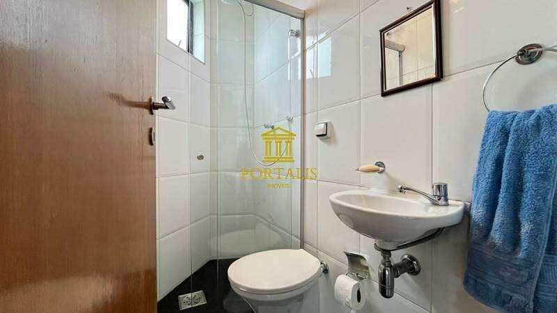Banheiro social com armário, espelho e box em blindex.