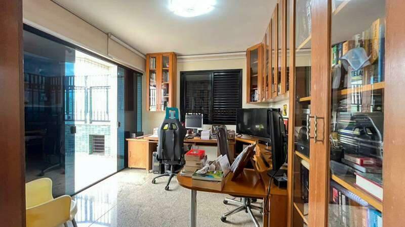 Escritório com armários planejados, perfeito para home office.