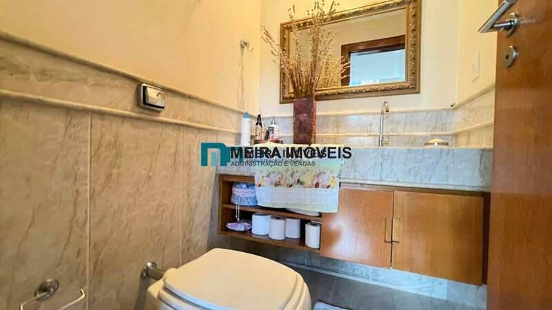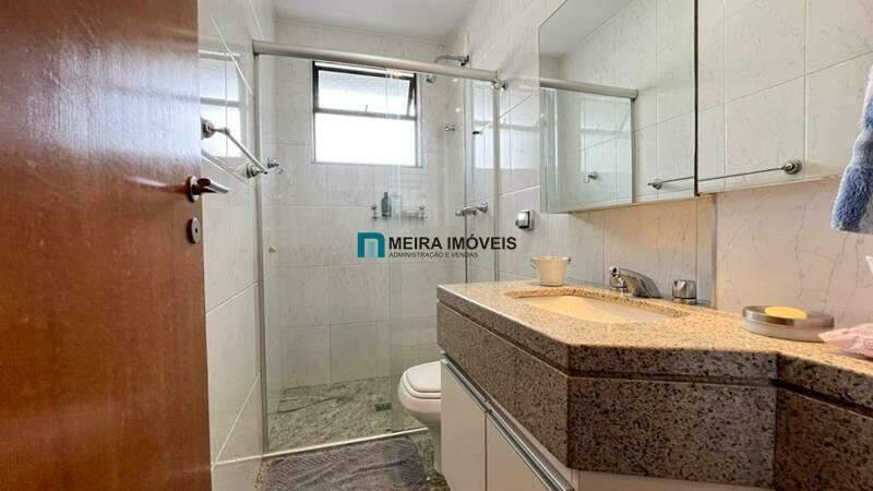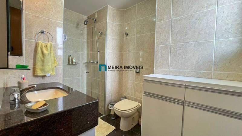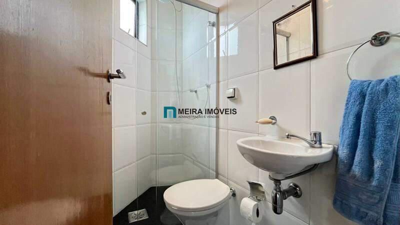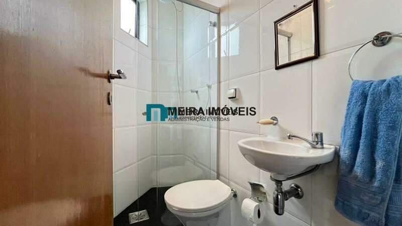 Banheiro social com armário, espelho e box em blindex.