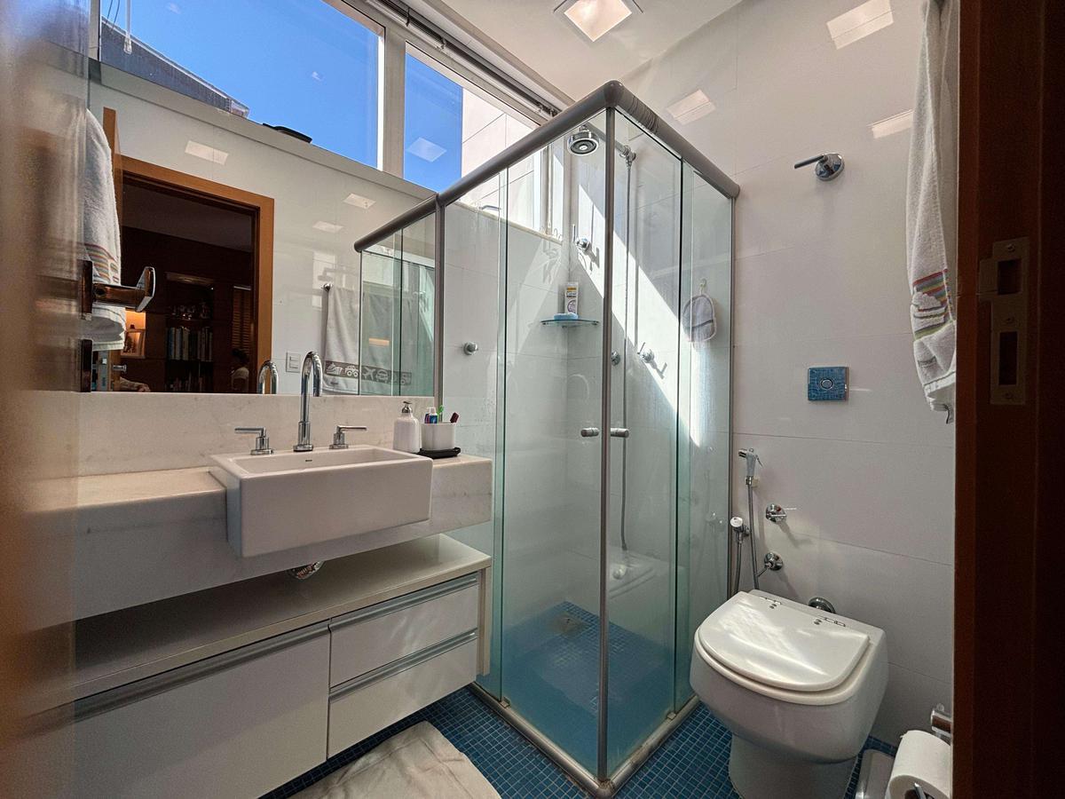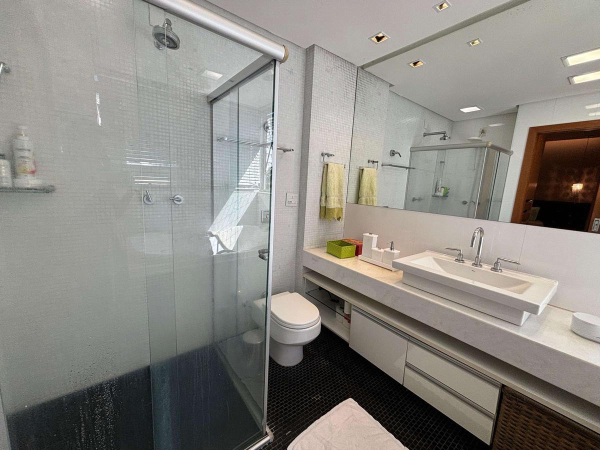 Banheiro com box em blindex, armário planejado, espelho e iluminação refinada.